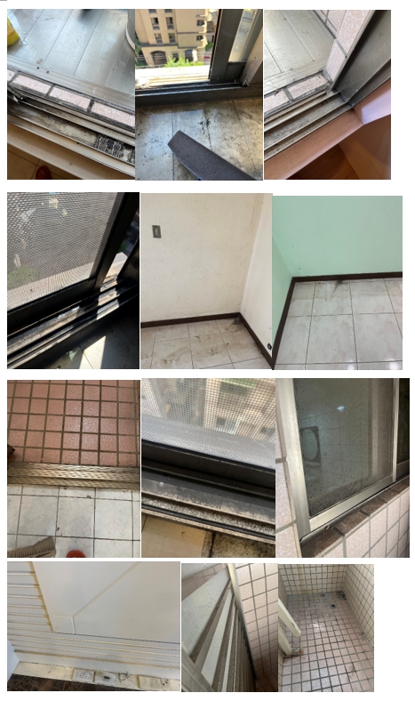 窗軌縫隙、地板邊角與浴室磁磚累積了灰塵與污漬,